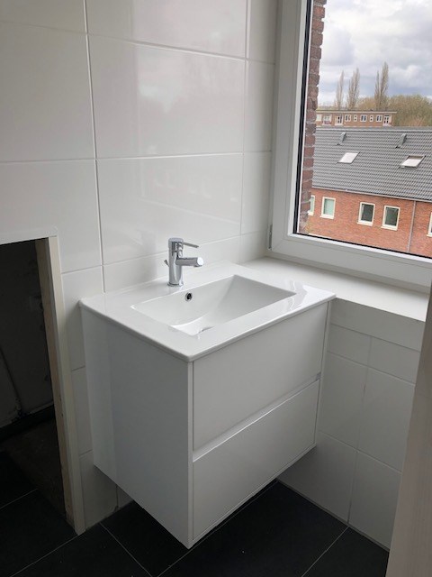 De badkamer beschikt over een groot raam, wat zorgt voor veel natuurlijke lichtinval, en is uitgerust met een douchecabine en een wastafel met meubel. Daarnaast is er ruimte om een wasmachine te plaatsen.
